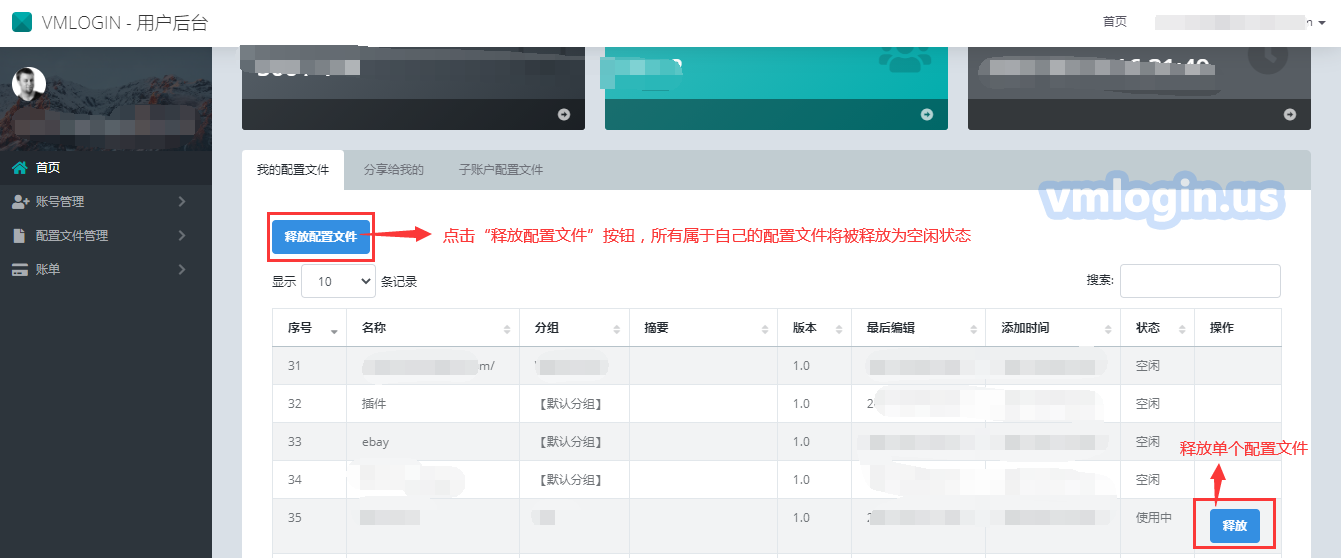 b. 可以登陆Web用户后台,有释放配置文件的按钮。配置文件列表里有单项释放,和释放所有的可供用户自己选择。