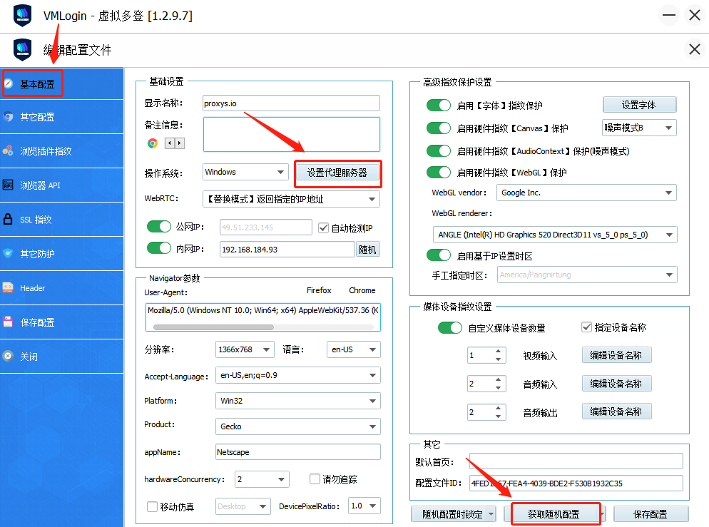 2.打开 VMLogin,如下图,新建浏览器配置,点击获取随机浏览器配置,也可根据自己的需求选择。
