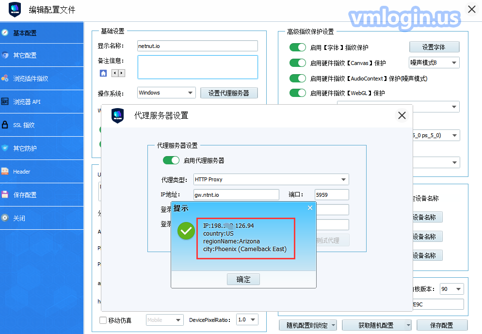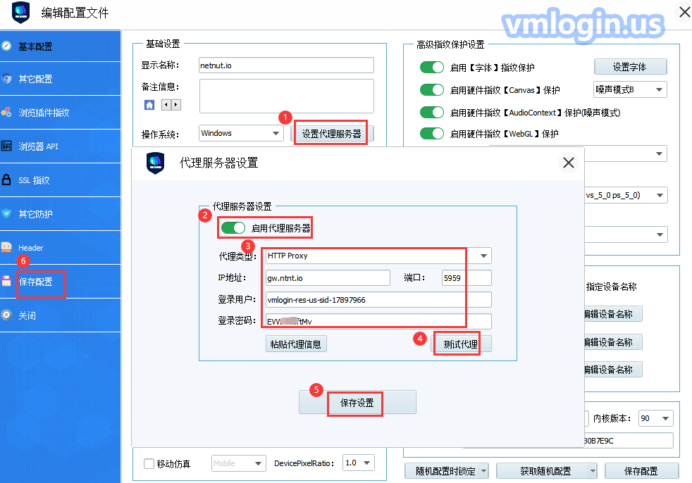 6. 基本配置-->设置代理服务器-->启用代理服务器,如果使用动态住宅IP,请输入以下信息: