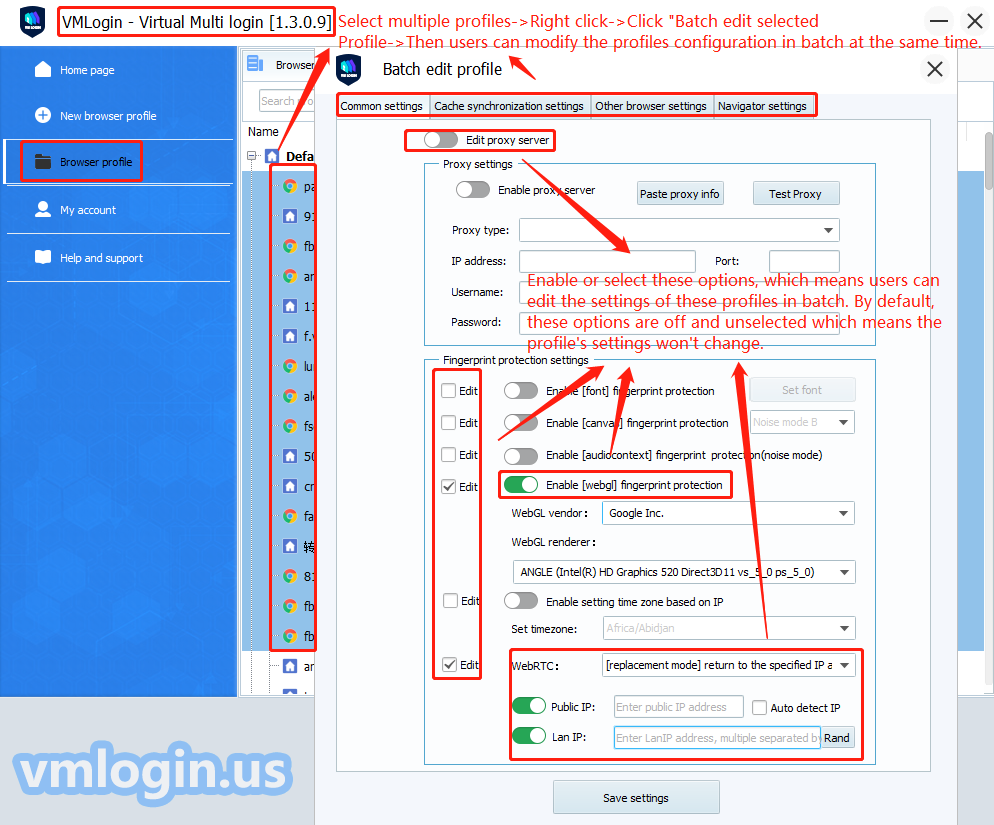 Edit proxy configuration, batch edit selected profile, cookie import and export, upload synchronous data to server, profile share, transfer, and other functions as shown below: