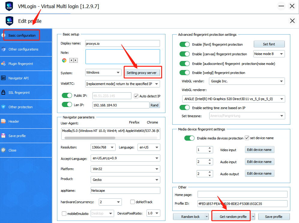 2.Open VMLogin, as shown below, to create a new browser profile, please click ”Get random profile” button to get a random browser profile, or you can also set it according to your own needs.