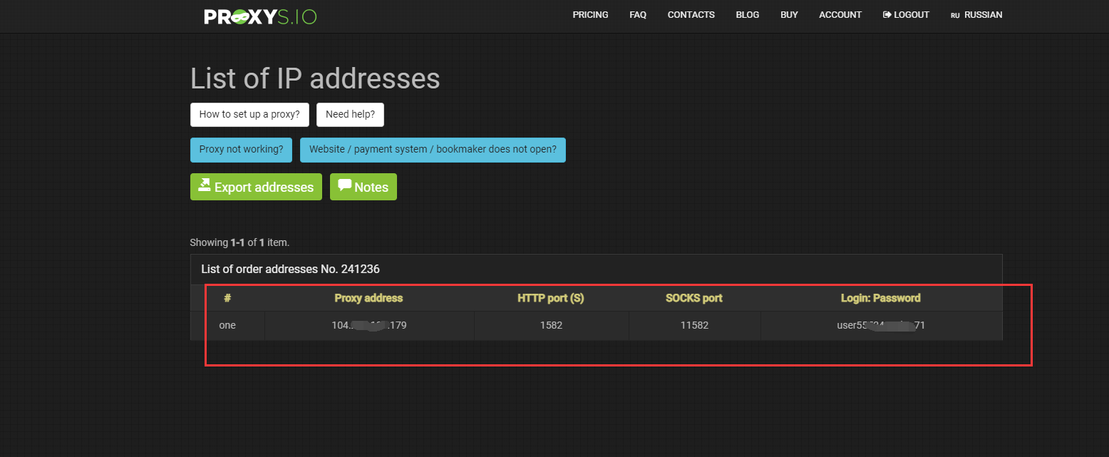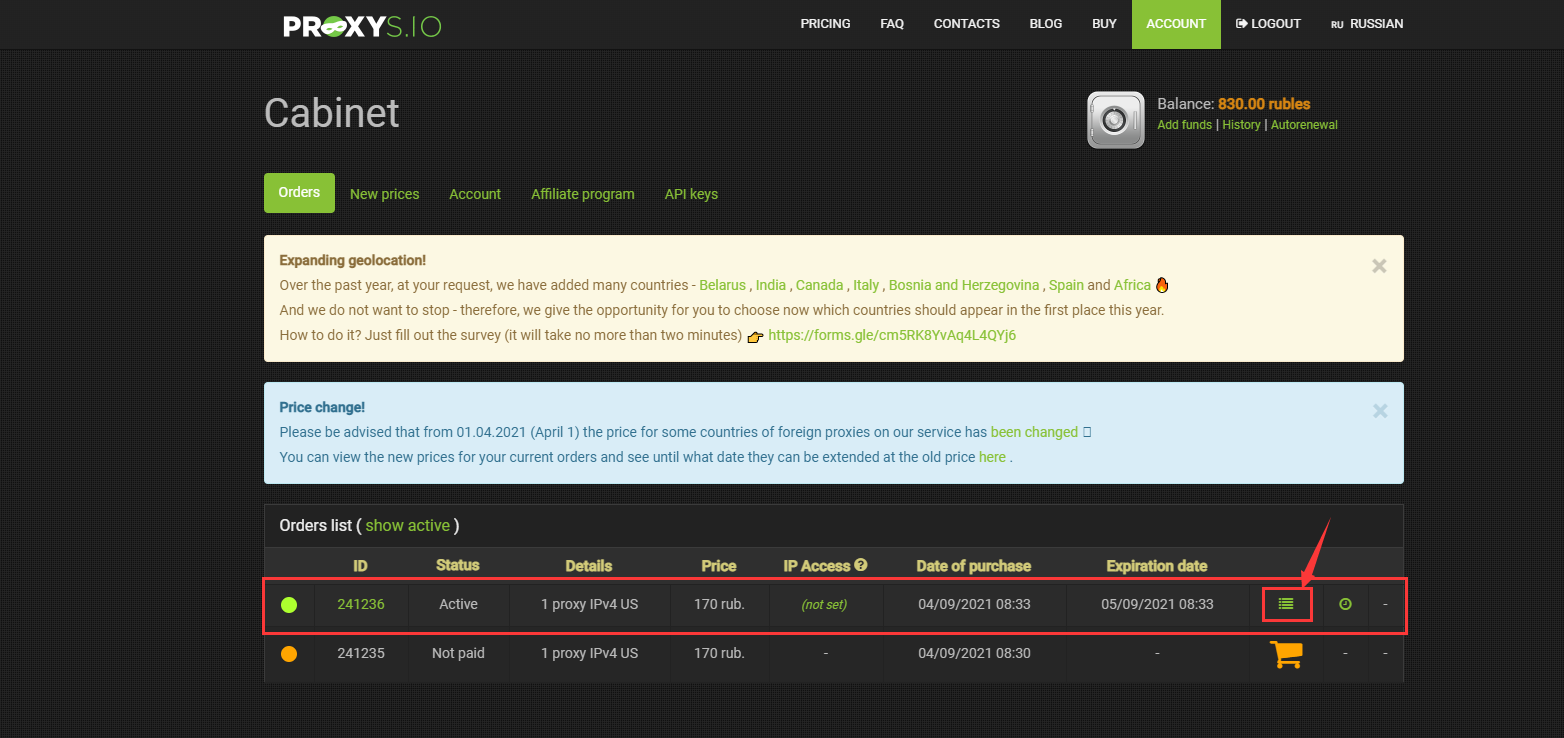 5.You will see your orders list as shown below, click it and you will see the IP:Port:Username:Password.