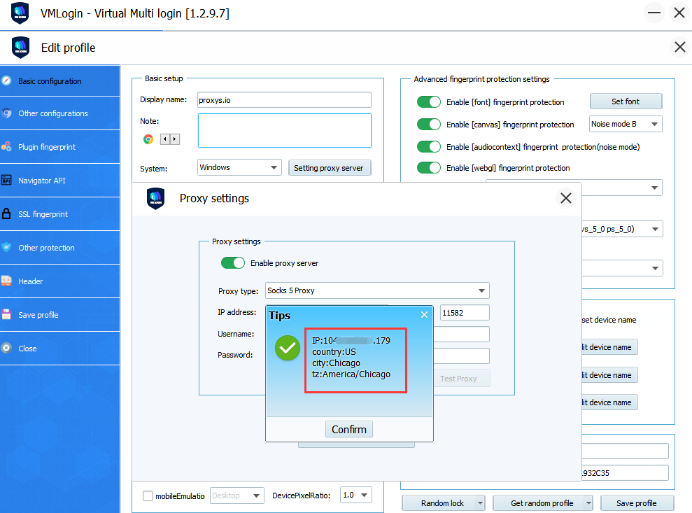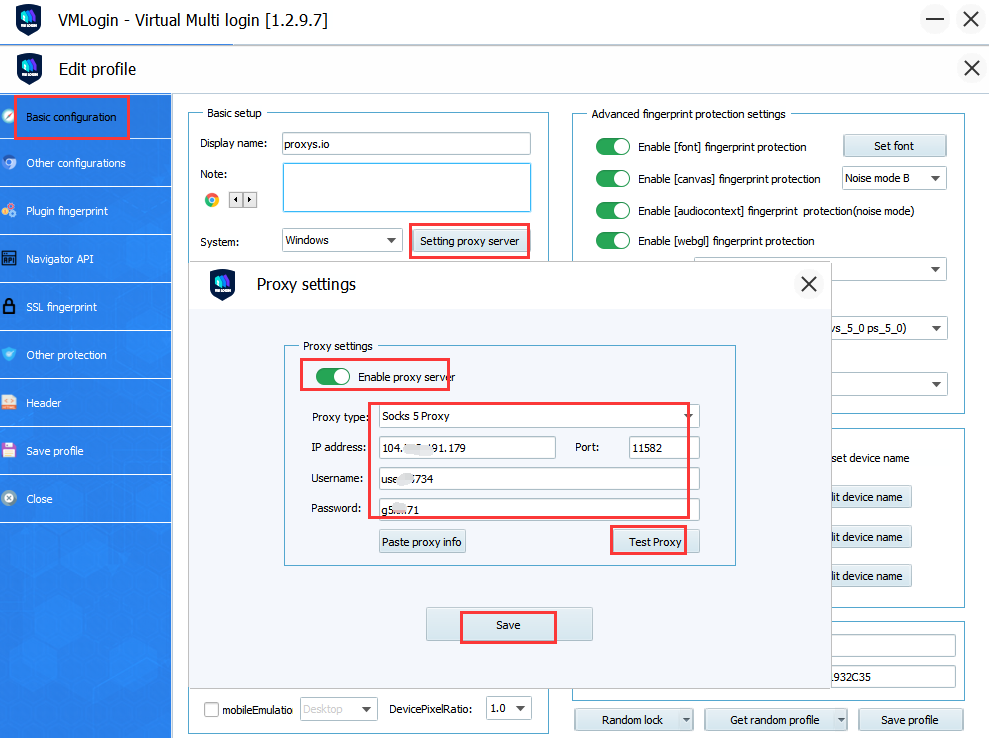 6.Open the VMLogin client version, click "Setting proxy server" in basic profile bar, click ”enable proxy server” button, both HTTP and SOCKS5 are OK, enter the IP address, port, username and password, click “Test proxy” to check whether it is connected, if it connects successfully, click “Save” button, then you can open the browser to use.