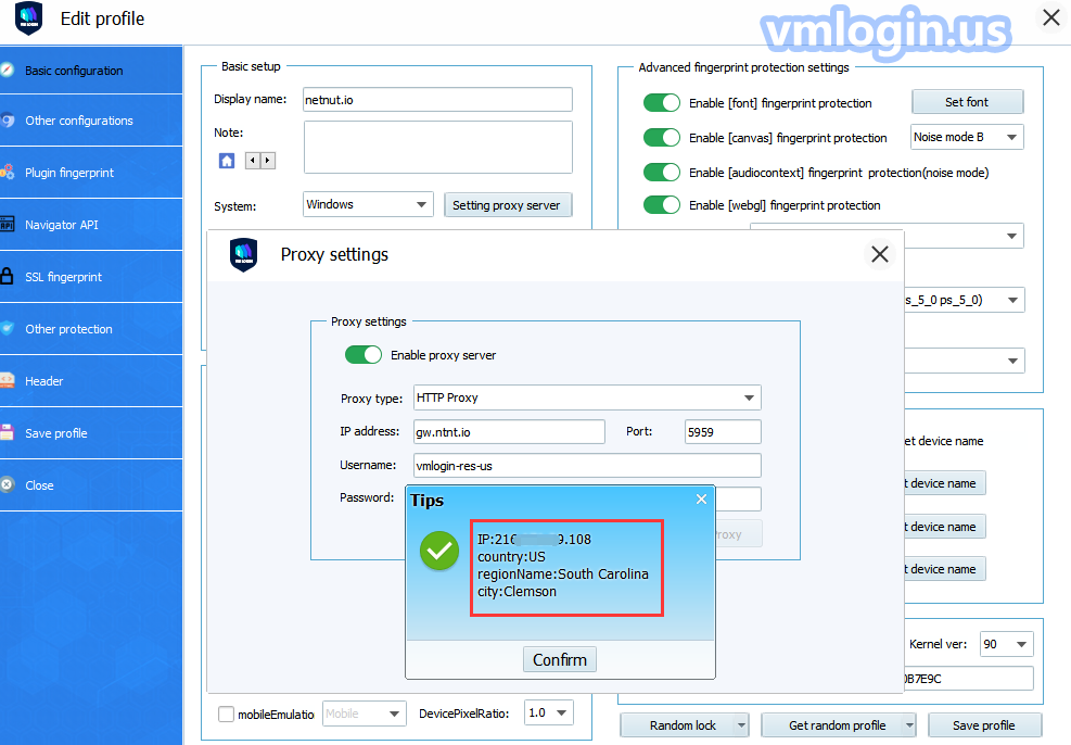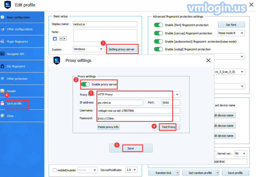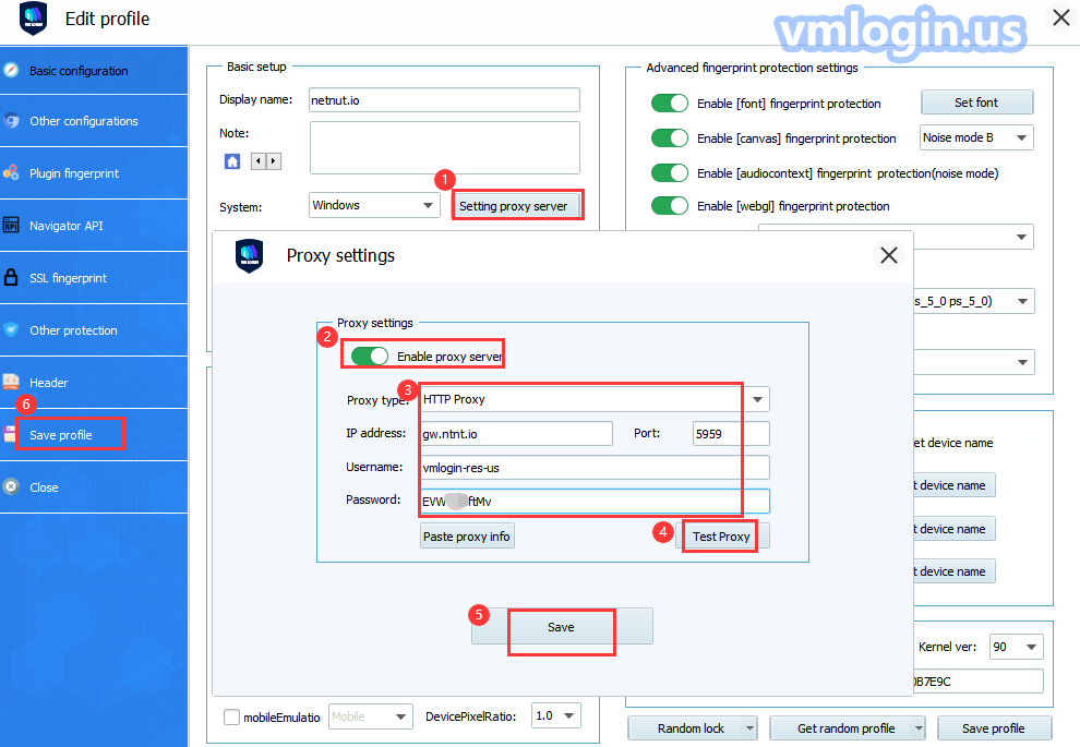6. Basic configuration-->Setting proxy server-->Enable proxy server. For rotating residential IPs type, fill in the credentials as follows: