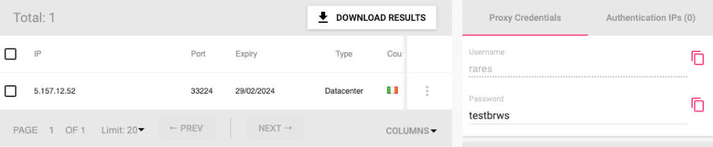 After navigating to your proxies, you'll be presented with a detailed view. In the main table, you'll find the IPs and ports for your proxies. On the right sidebar, the Proxy Credentials section displays your username and password.