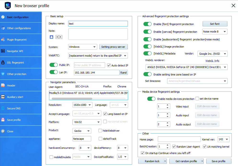 (2) Select the settings that best suit you, such as operating system, screen resolution, language, WebGL vendor, time zone, media device fingerprint, etc., you can also random the profile settings to get new fingerprint.