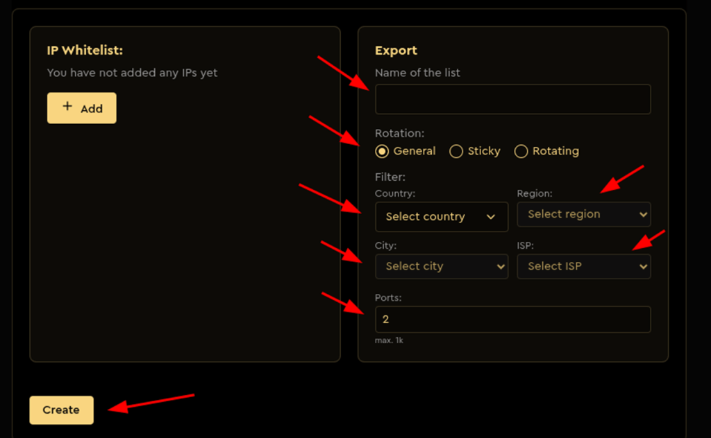 4. Fill in all the fields. Select a rotation. General—changes the IP address for each request. Permanent or rotating. Enter a list name, select the country, region, city, and provider.