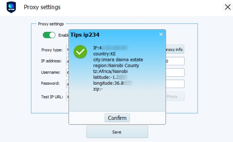 5. 点击测试代理, 测试成功后,点击保存代理。