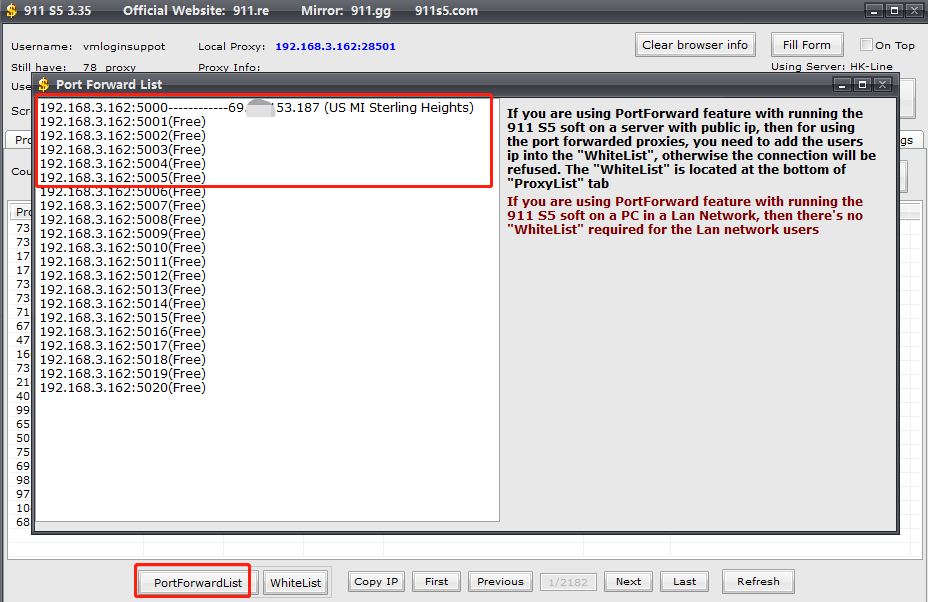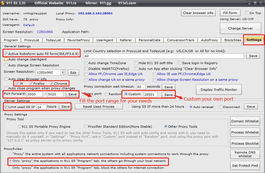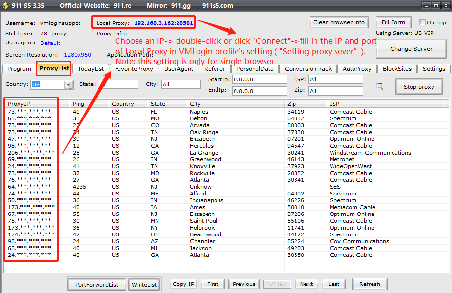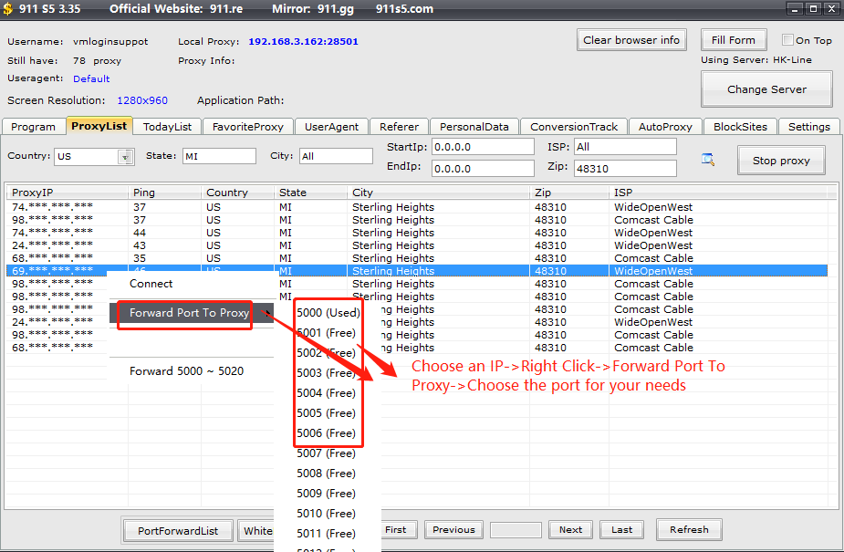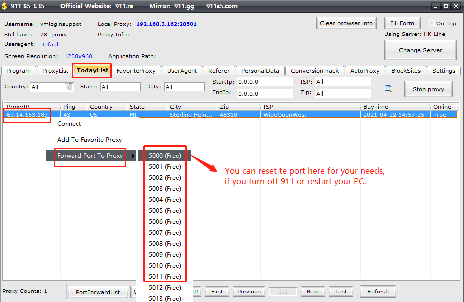 Note: The IP in red of "Proxy info" is the connected IP, which means that you cannot set a new port unless you restart 911 S5.