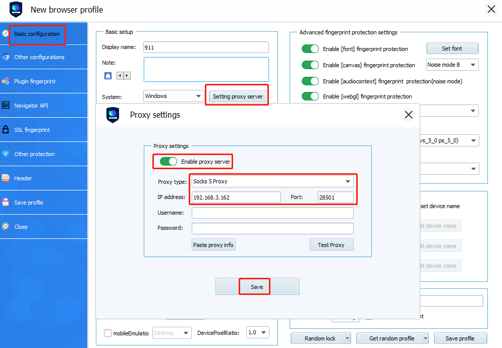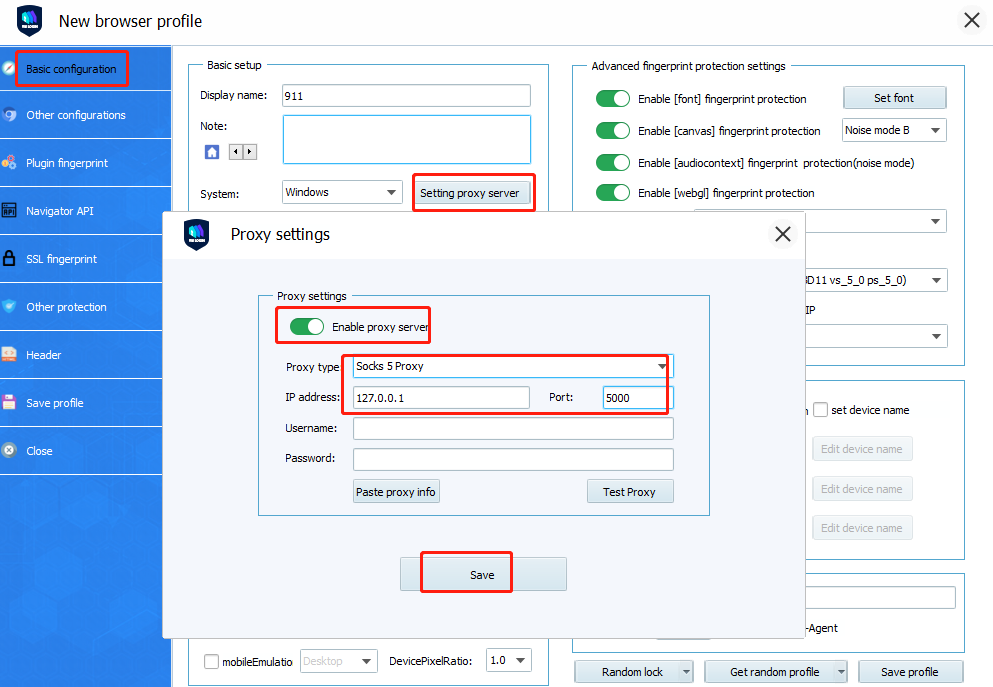5.Launch VMLogin client-> Create the new VMLogin profile -> Click the“Setting proxy server” button -> Turn on the button of “Enable proxy server”. Select “Sock 5” for proxy type -> Check the IP and port in “Local Proxy” of 911 S5 (in blue), then enter the IP and port. Username and Password fields need to be left blank. As shown below: