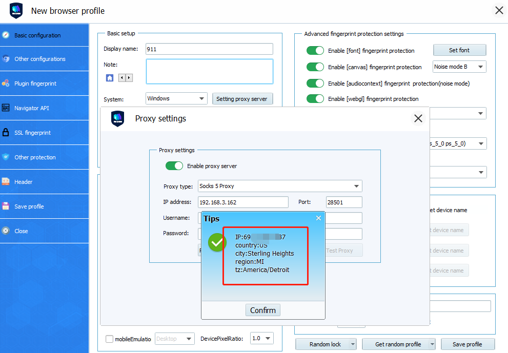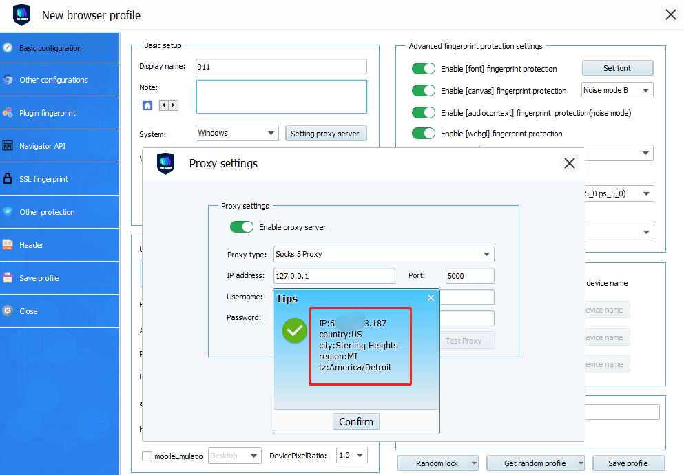 6.Click “Test Proxy”, and after the test, related IP information will prompt up. Then save the settings, you can launch the profile to open the browser to test the socks5 proxy.