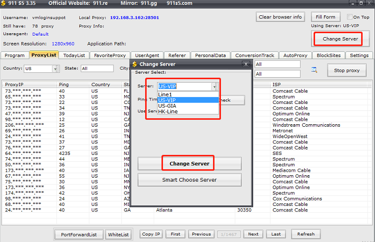3. You can also try to change another line in the "Change Server" on the 911 S5 interface.