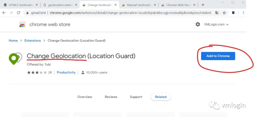 扩展商城里搜索安装 Change Geolocation,注意的一点就是VMLogin的配置文件里的 User-Agent 要是 Chrome 浏览器类型,不然在线安装插件时会认为浏览器不是 chrome 而无法安装。