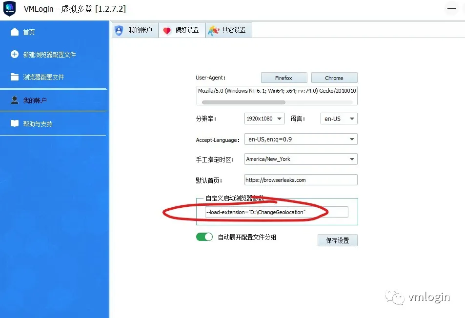 当这样设置后,新建出来的配置都会自动加载定位插件。不用一个个浏览器的来安装。 其它的小插件也可以用这类方法安装加载。如果要加载多个插件,插件目录中间用逗号要分割一下:
