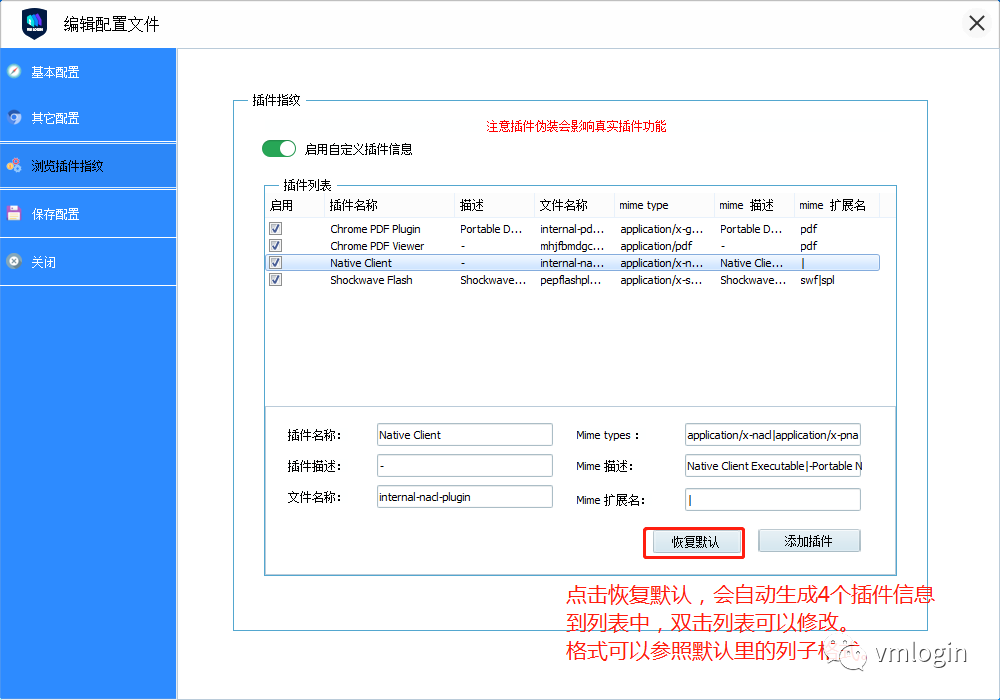 插件指纹默认是不开启状态,默认插件列表也是空的,当我们打开《启用自定义插件信息》开关时,可以点击《恢复默认》按钮,它会自动生成4个基础的插件信息。双击列表,可以在下面修改插件相关信息,再点《添加插件》按钮就会修改成功。那么这里要提到的一点就是,如果启用了插件纹指功能,那么会影响到浏览器正常的插件功能,比如PDF就看不了等。