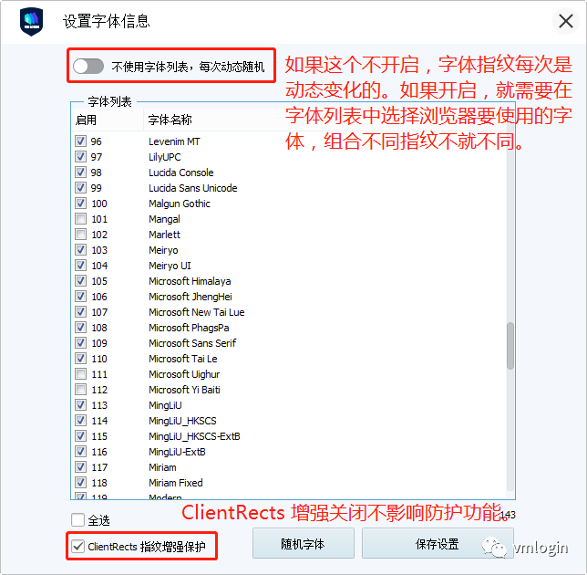 我们可以进入到设置字体界面,如上图,默认是不使用字体列表,每次动态随机的字体指纹。